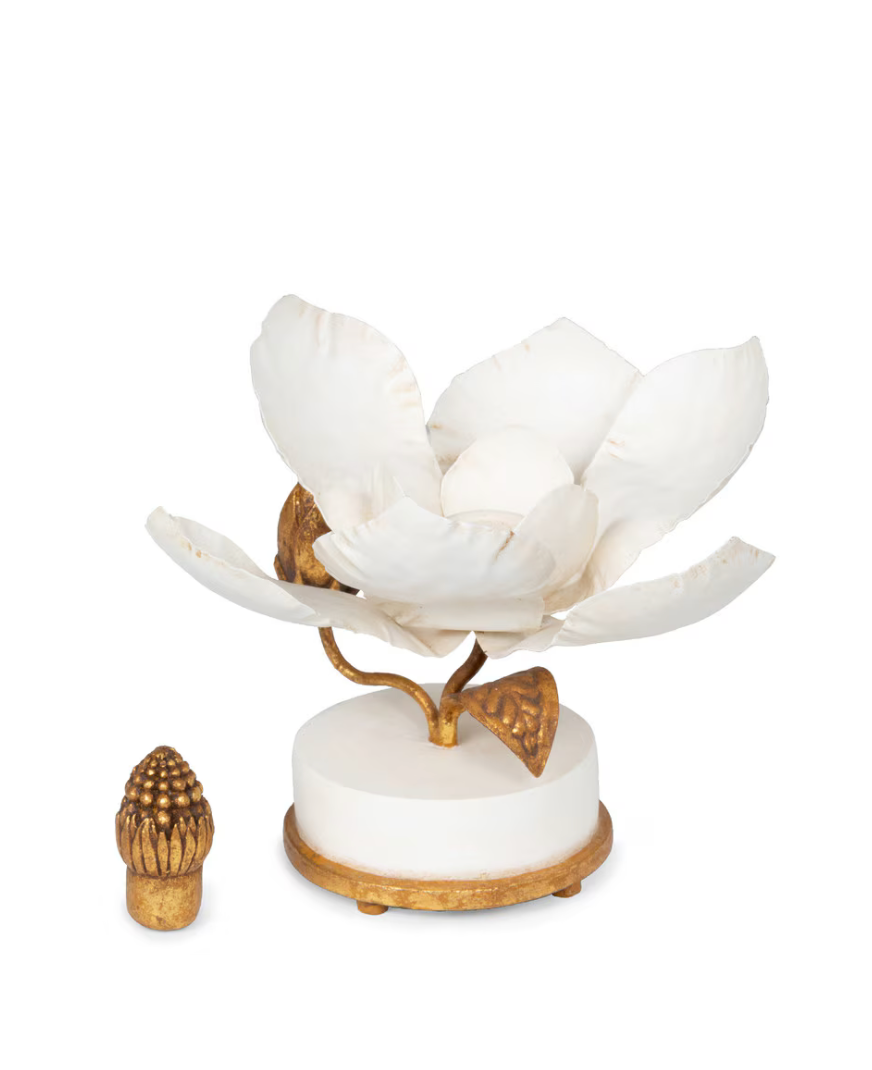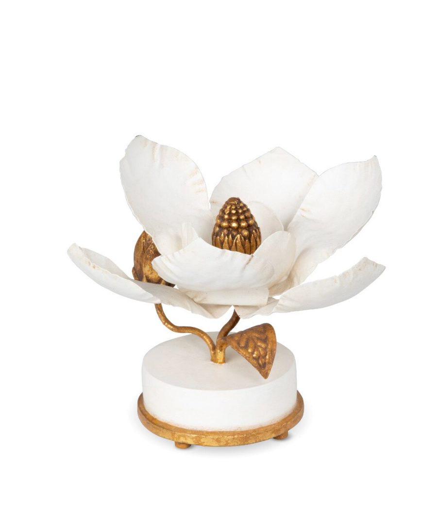 Transform any room into a sanctuary of warmth and sophistication with this exquisite Hand Sculpted Magnolia Candle Holder from Park Hill Collection. Standing at 6 inches tall, this captivating piece features delicate magnolia blooms hand-sculpted in white and luxurious gold, creating the perfect blend of natural beauty and modern elegance that elevates your home décor.